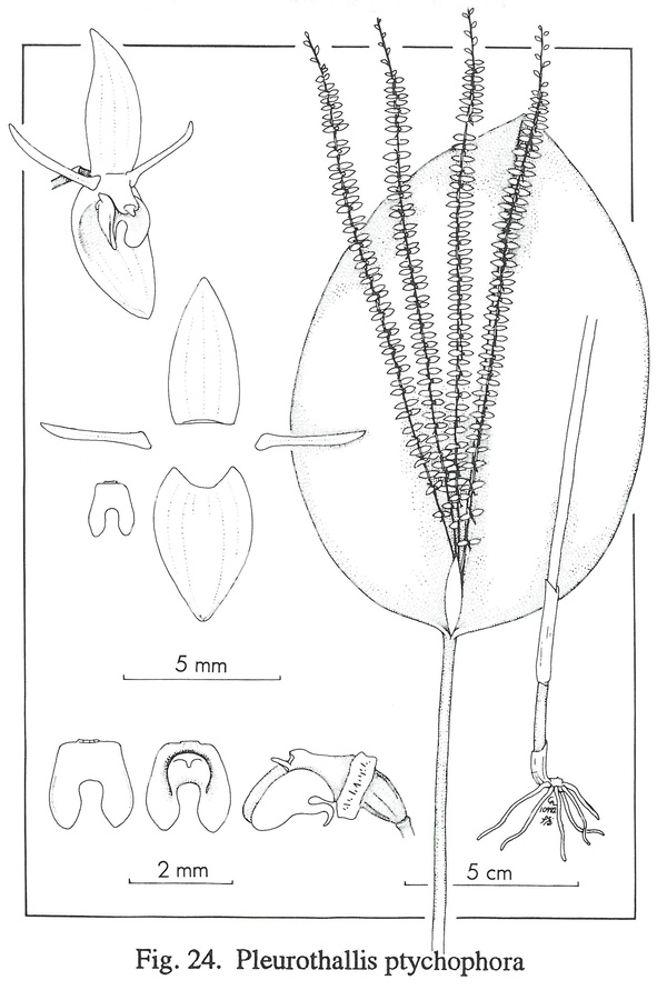 References Icones Pleurothallidinarum Vol XVIII Systematics of Pleurothallis subsection Antenniferae, Longiracemosae, Macrophyllae-racemosae and Subgenera Pseudsostelis and Acuminata Luer 1999 drawing fide; Icones Pleurothallidinarum Vol XVIII Systematics of Pleurothallis subsection Antenniferae, Longiracemosae, Macrophyllae-racemosae and Subgenera Pseudsostelis and Acuminata Luer 1999 drawing ok see Caution above; Native Ecuadorian Orchids Vol 4 Dodson 2003 photo fide;