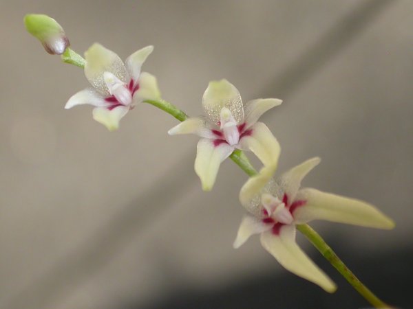 Found in Rio de Janiero state of Brazil as a mini-miniature to miniature sized epiphyte with cylindric ramicauls enveloped by 3 to 4 soon evanescent sheaths and carrying a single, elliptic-oblong, subacute to obtuse, minutely tridentate apically, attenuate below into the base leaf that blooms on 1 to 2, erect, longer than the leaf, arising through a short spathe, peduncle filiform, 2 to 3.2" [5 to 8 cm] long, adorned with 3 to 4 bracts, rachis secund, distantly 5 to 6 flowered inflorescence
