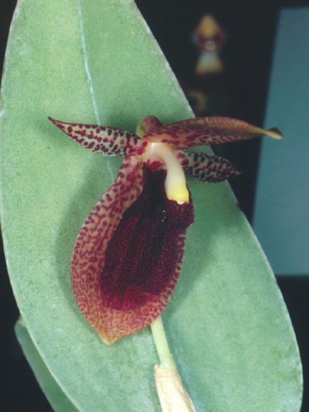 Found in Colombia and Venezuela at elevations of 2475 to 2550 meters as a small sized, cold growing, epiphyte with slender, erect, ramicauls enveloped basally by 2 to 3 tubular sheaths and another below the middle and carrying a single, apical, erect, thickly coriaceous, blue-green glaucous below, elliptical-obovate, subacute t oobtuse, rounded or broadly cuneate below in to the contracted, twisted petiolate base leaf that blooms on an erect, successively single flowered fascile arising from near the apex of the ramicaul through foliacous spathe and carrying thin, tubular floral bracts.