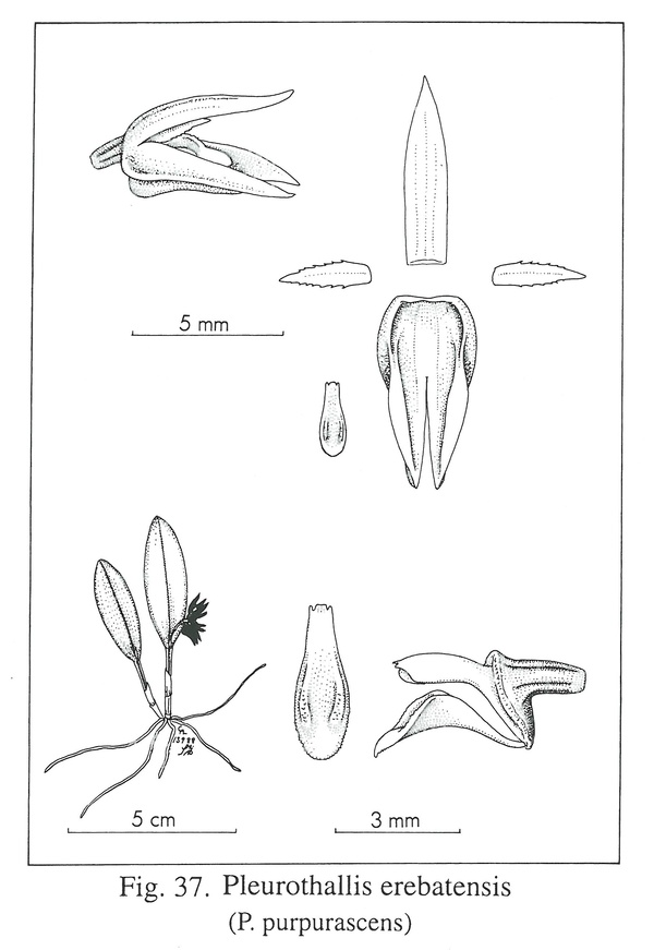References W3 Tropicos, Kew Monocot list , IPNI ; Native Ecuadorian Orchids Vol 4 Dodson 2003 drawing fide; Icones Pleurothallidinarum Vol XXVI Luer 2004 as P erebatensis [P purpurescens] drawing fide;