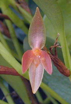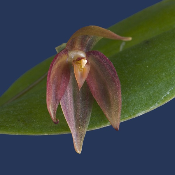 Found in Valle de Cauca Colombia without locational data as a small sized epiphyte with slender, erect, round in cross-section ramicauls enveloped basally by a close, tubular sheath above the base and another at the base and carrying a single, apical, erect, coriaceous, sessile, ovate, acute, braodly cuneate below into the petiolate base leaf that blooms in the spring on a fascile of solitary, .6" [1.5 cm] long, successive flowered inflorescence arising through a prostrate spathe from the base of the leaf.