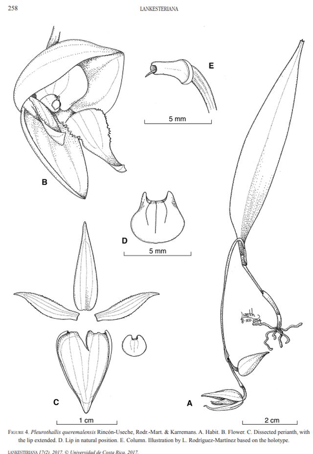 "Pleurothallis queremalensis belongs to Pleurothallis sect. Pleurothallis subsect. Macrophyllae-Racemosae Luer 1999, of which Pleurothallis lindenii Lindl. is probably the most representative species. The novelty is closely related to Pleurothallis cachabensis Luer & Hirtz, P. cajamarcae Schltr. and P. tiarata Luer & Hirtz, but the most closely related species is probably P. phratria. Pleurothallis queremalensis can be distinguished from the latter by the narrowly ovate dorsal sepal (vs. elliptic), the red, lanceolate petals with the margins serrulate (vs. purple, linear-oblong and margin entire), and the suborbicular, non-apiculate lip (vs. cordate, apiculate)." Rodr.-Mart & Karremans 2017