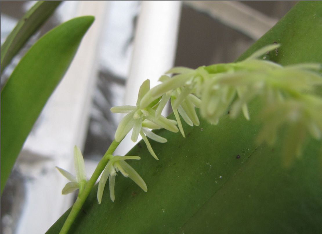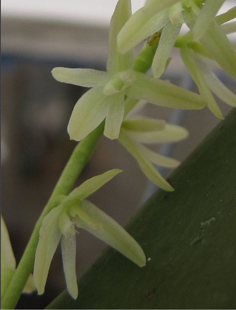 Found in Rio de Janiero state of Brazil in wet montane forests at elevations around 1200 to 1300 meters as a small sized, cool growing epiphyte with slender, compressed towards the apex, deeply furrowed ramicauls enveloped below by 3, short-lived, tubular sheaths and carrying a single, apical, erect, stiff, elliptical, dark olive green leaf that blooms in the summer and fall on to 3, curved, slender, 4 to 5.6" [10 to 14 cm] long including the 1.2 to 1.4" [3 to 3.5 cm] long peduncle, simultaenously 20 to 30 flowered inflorescence arising through a spathe at the base of the leaf and carrying unpleasantly scented flowers.