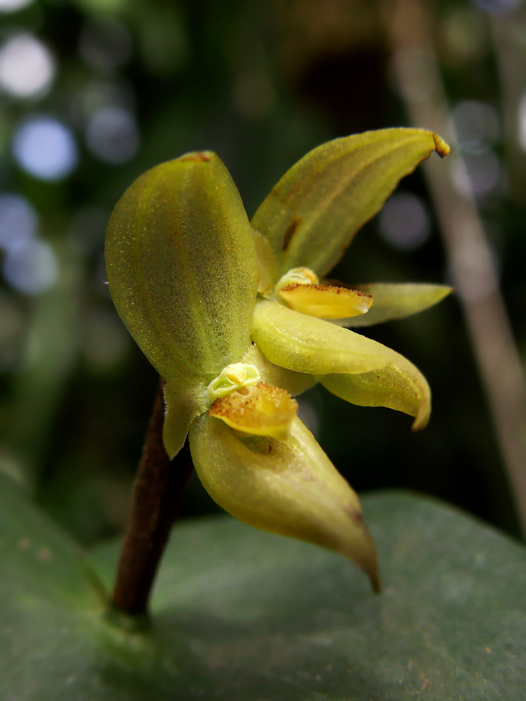 Found in Costa Rica in forests at elevations around 1500 to 1900 meters as a small sized, cool growing terrestrial with slender, erect ramicauls enveloped by a close tubular sheth below the middle and 2 to 3 others at the base and carrying a single, apical, suberect to horizontal, coriaceous, narrowly ovate, acute deeply cordate and sessile base leaf that blooms in the winter on a fascile of successively erect, resupinate, single flowered inflorescence arising through an erect spathe with the peduncle concealed within and thin tubular floral bracts.