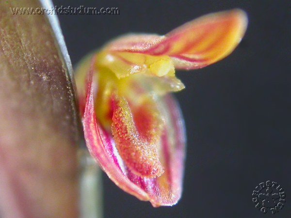 Found in Ecuador and Brazil on relict trees at elevations of 900 to 1300 meters as a small to medium sized, warm to cool growing epiphyte with a creeping rhizome giving rise to an erect ramicaul enveloped by 1 to 2 sheaths and carrying a single, apical, erect, ovate to elliptic, reflexed apices, conduplicate, leathery, dark olive green tarnished white leaf that blooms in the fall on a short to [8 mm] long, 1 to 2 flowered inflorescence arising through a spathe.