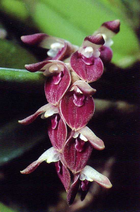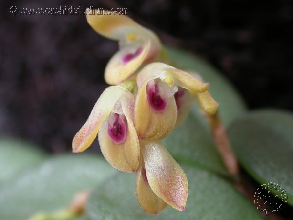 Found in Ecuador, Peru, Bolivia and Brazil at elevations of 600 to 1400 meters in semi wet forests, wet montane forests and primary cloud forests as a mini-miniature sized, warm to cool, growing, creeping epiphyte with ramicauls entirely enveloped by sheaths and carrying a single, apical, ovate, fleshy, conduplicate, dark olive green, purple flecked beneath, mostly prostrate leaf that blooms in the late spring through earlier fall on 1 to 2, apical, racemose, pendulous, 1 to 2" [2.5 to 5 cm] long, 3 to 9 flowered inflorescence with up to 5 flowers open at any one time.