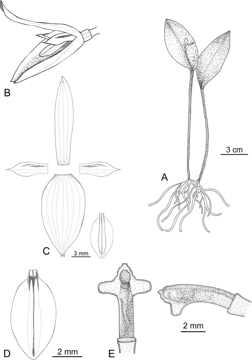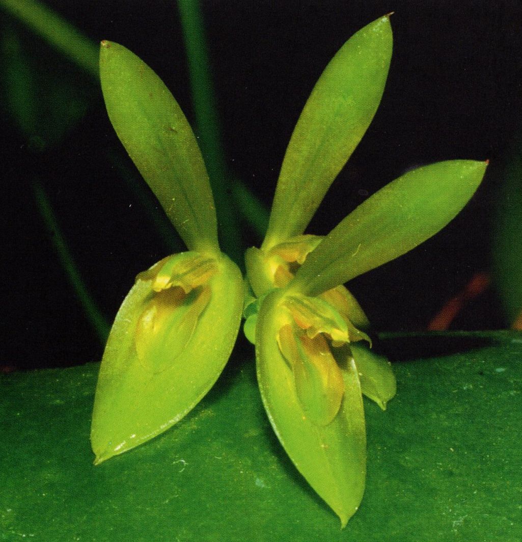Found in Amazonas, Pasco and Huanuco departments of Peru in remnant or degraded forests at elevtions of 1700 to 2200 meters as a miniature to small sized, cool to cold growing, caespitose epiphyte with steout, erect, terete below, sulcate above ramicauls enveloped basally by 2 tubular sheaths and carrying a single, apical, erect, coriaceous-thickened, ovate to elliptic, cuneate, sessile and decurrent along the ramicaul for .4 to .8" [1 to 2 cm], that blooms in the fall and early winter on 1 to 2, arising through a conduplicate spathe, peduncle .6 to 1" [1.5 to 2.5 cm] long, racemose, successively single to 3 flowered inflorescence with funnel-shaped, obtuse, membraneous, longer than the ovary floral bracts.