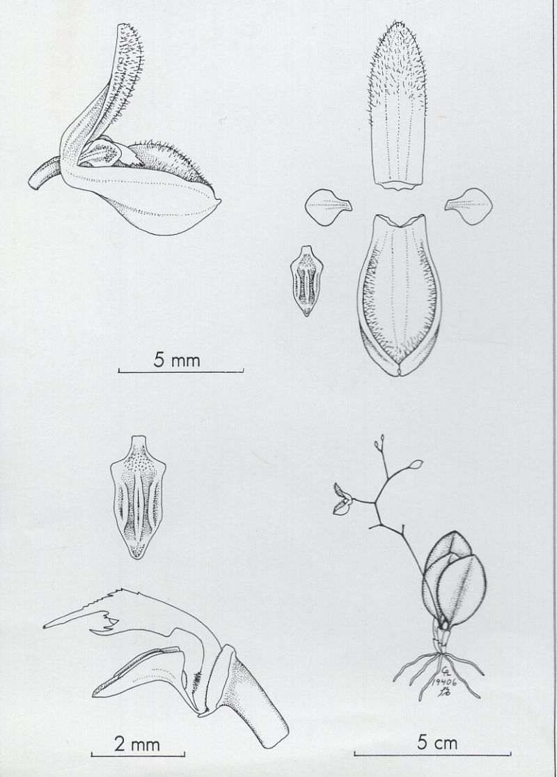 Found in Ecuador without collection data as a mini-miniature sized epiphyte with stout, erect ramicauls enveloped by a tubular sheath near the middle and 2 others at the base and carrying a single, apical, erect, coriaceous, broadly elliptical, obtuse, abruptly contracted below into the petiolate base leaf that blooms in the late winter and early spring on a weak, suberect to arching, lax, distichous, flexuous, to 3.2" [to 8 cm] long including the 1.2" [3 cm] long, successively several flowered inflorescence arising from below the apex of the ramicaul.