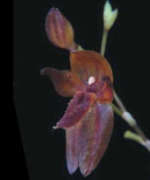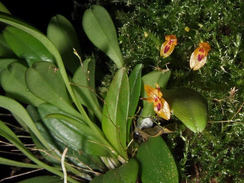 Found in Panama and Colombia at elevations of 1100 to 1400 meters as a miniature sized, cool growing epiphyte with erect ramicauls enveloped basally by 2 to 3 tubular sheaths and carrying a single apical, erect, coriaceous, elliptic, obtuse, gradually narrowing below into the elongate, petiolate base leaf that blooms in the fall on an erect, 2 1/4" [5.6 cm] long, single flowered inflorescence.
