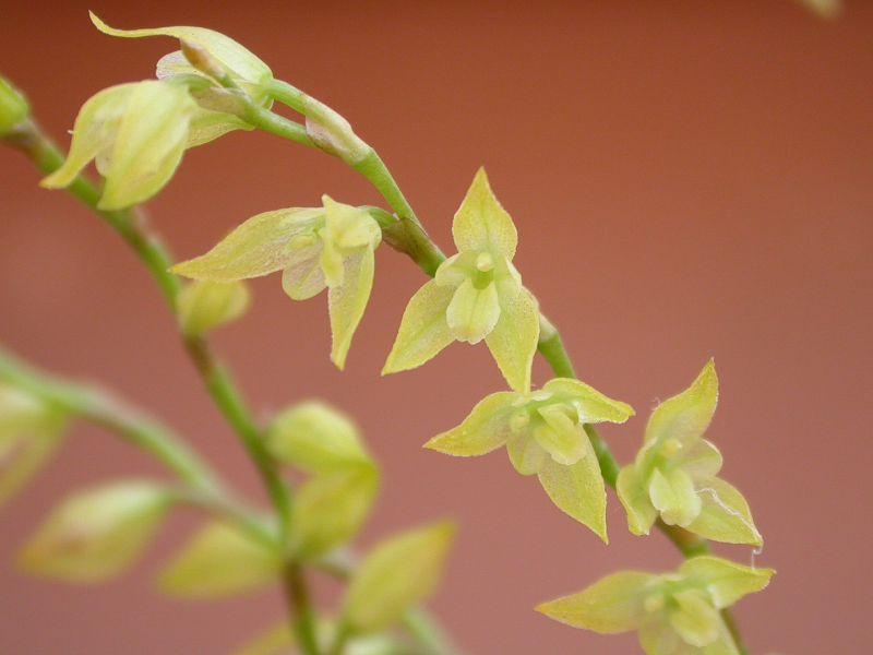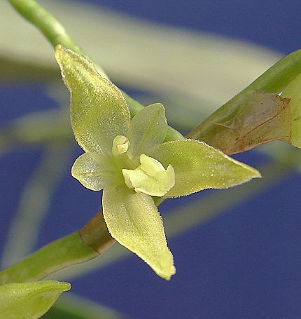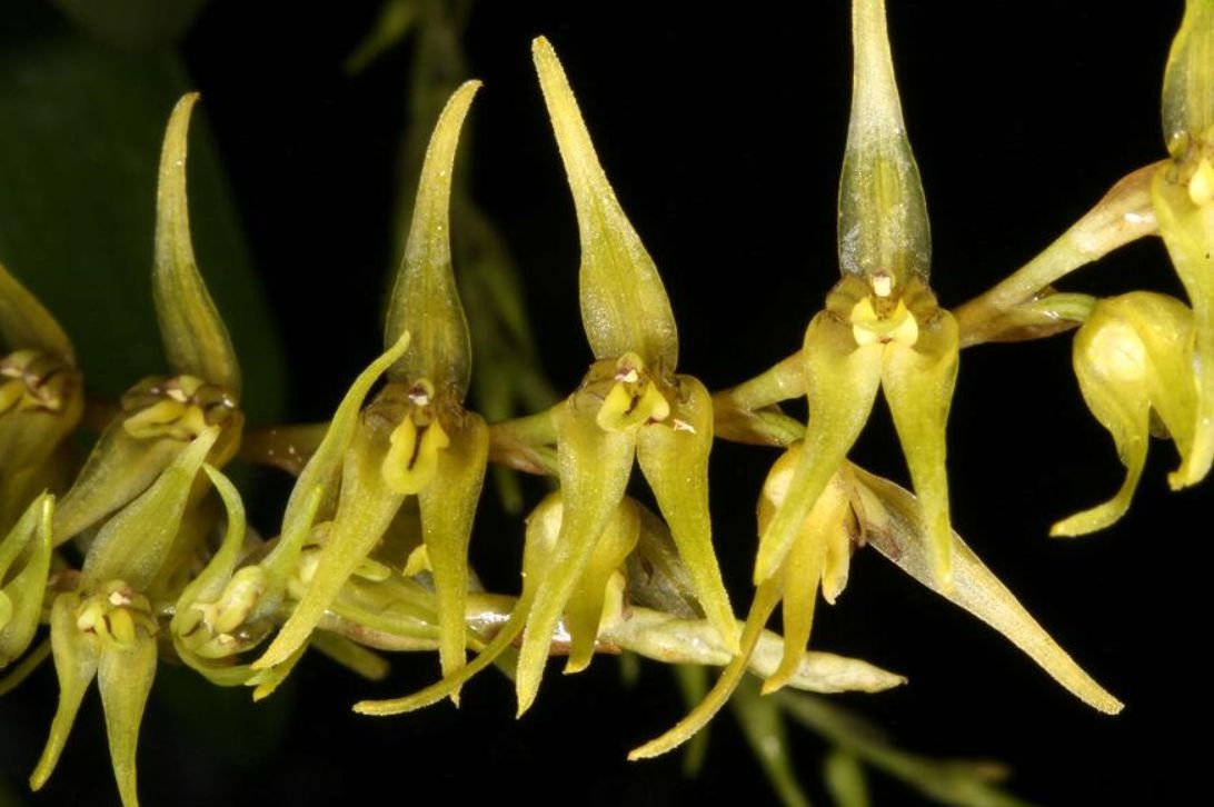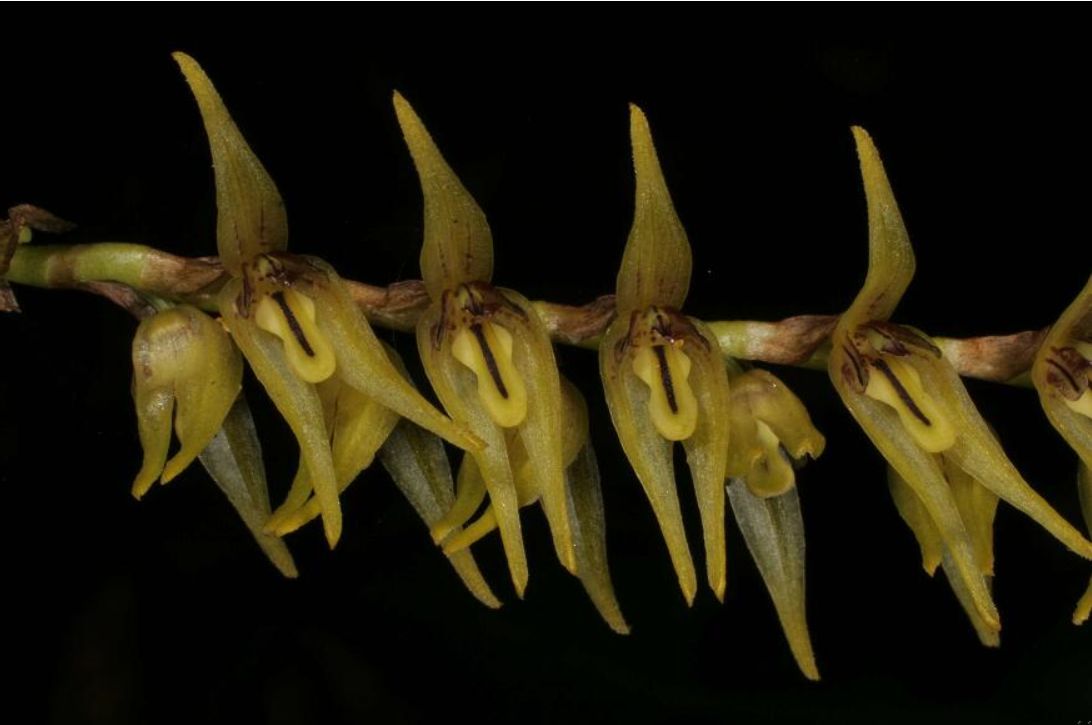 Found in Ecuador, Peru, Bolivia and Brazil in wet montane forests at elevations of 600 to 2750 meters as a miniature sized, warm to cold growing, caespitose epiphyte with erect ramicauls enveloped by 1 to 3 large, complanate, scarious sheaths and carrying a single, apical, oblong-elliptic, subacute, blunt, coriaceous leaf that blooms in the fall on an erect to arching, 4.4" [11 cm] long, simultaneously opening, several flowered, racemose inflorescence with several close, tubular bracts and ovate, acute, sub-infundibuliform floral bracts that cover 1/2 of the ovary.