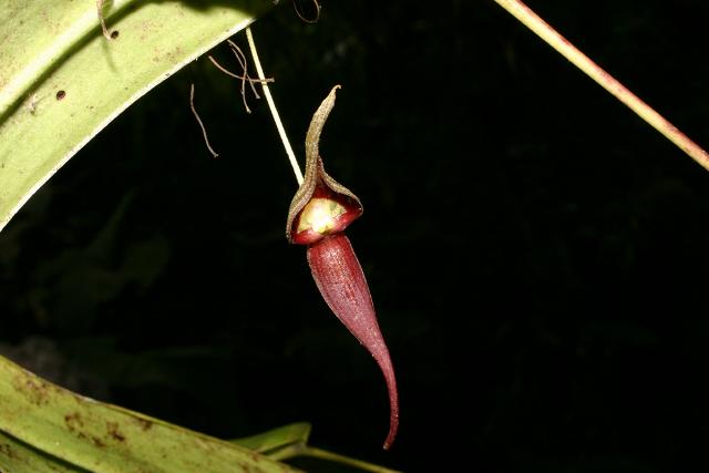 Found from Colombia, Ecuador, Peru, Bolivia and Venezuela in wet montane forests as a caespitose, small to medium sized, warm to cold growing terrestrial or epiphytic species from wet montane forests or cloud forests that is characterized by it's hanging solitary flower. It is found at altitudes of 750 to 2800 meters with a long, thin ramicauls enveloped basally by 2 long, close, tubular, distant sheaths and carrying a single, apical, erect, lanceolate, cordate, acute, abruptly narrowing below, prominent midvein, clear green leaf that blooms in the spring and summer on an apical, short, fasciculate, pendulous, successively single, few flowered inflorescence with a small scarious spathe with the flower held dangling from near the leaf base.