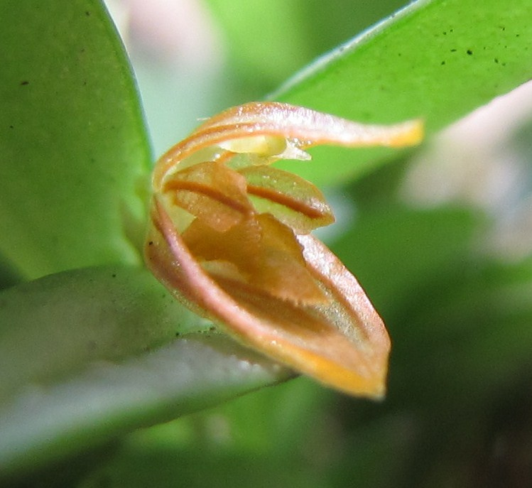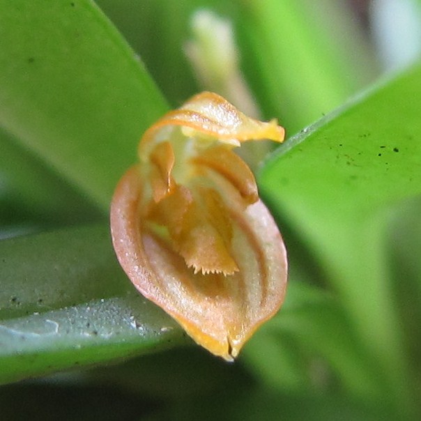 Found in Rio de Janiero and Sao Paulo Brazil in primary cloud forests at elevations of 500 to 800 meters as a mini-miniature sized, warm growing epiphyte with erect ramicauls enveloped by 3 sheaths and carrying a single, apical, erect, coriaceous, narrowly lanceoalte, light green leaf that blooms at most any time of the year on an erect, 1" [2.5 cm] long, zigzag, successively 1 to 2, 4 to 5 flowered inflorescence