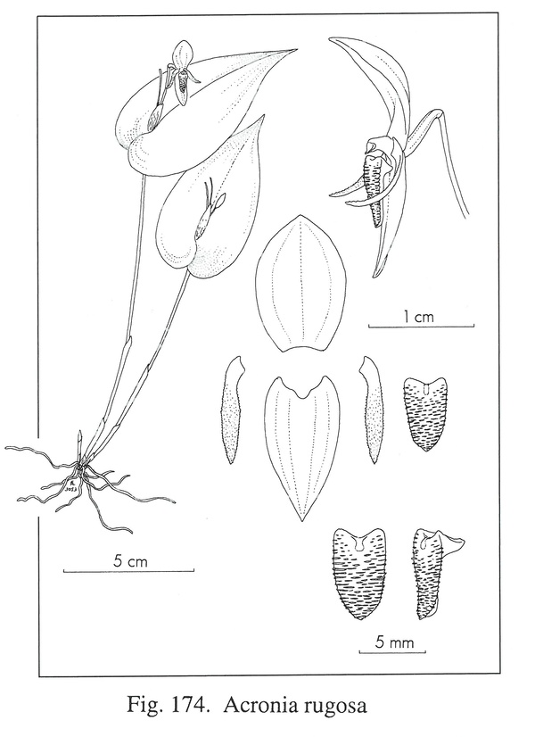 References W3 Tropicos, Kew Monocot list , IPNI ; *Orquideologia Vol 15 #2-3 1982 drawing fide; Icones Pleurothallidinarum Vol XXVII Luer 2005 as Acronia rugosa drawing fide; Orquideas de Farallones de Cali Galindo-Tarazona, Haelterman, Zuluaga Trochez and Sebastian Moreno 2020 photo fide