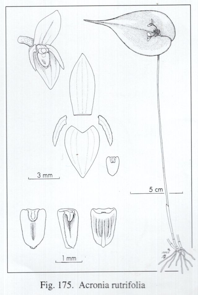 References W3 Tropicos, Kew Monocot list , IPNI ; *Icones Pleurothallidinarum Vol XXVII Luer 2005 as Acronia rutrifolia drawing fide;