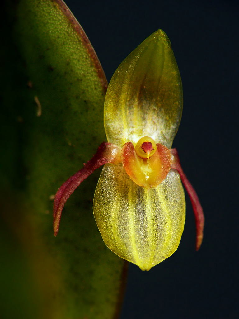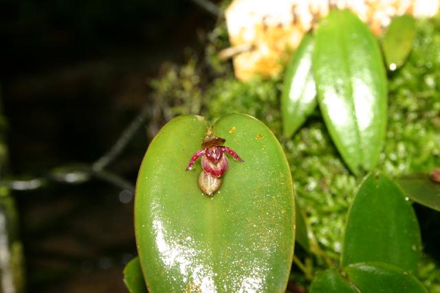Found from Guatemala, Costa Rica and Panama in lower montane rainforests at elevations of 860 to 1500 meters as a miniature sized, warm to cool growing epiphyte with rigid ramicauls subtended by 2 tubular sheaths and carrying a single, apical, lanceolate-elliptic, cordate, coriaceous, fleshy leaf that is conduplicate at the base blooming in the late spring through late winter on a short inflorescence with 1 or 2 simultaneously opening flowers held close to the leaf base.