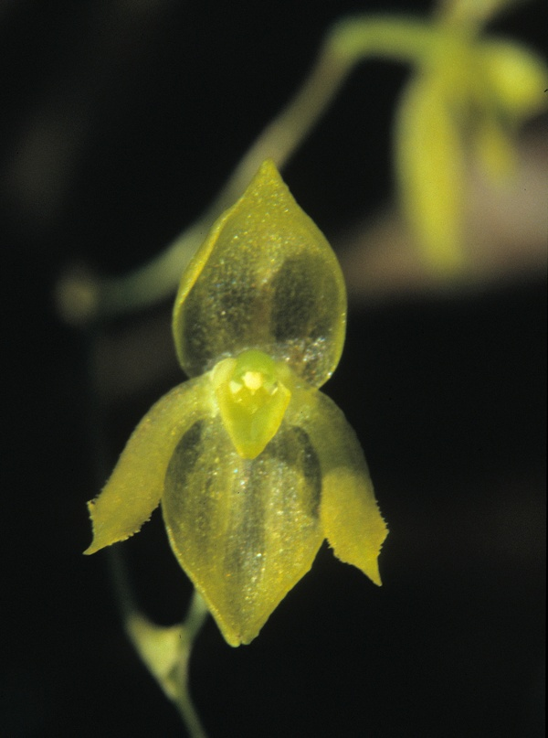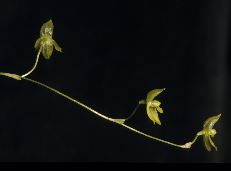 Found in northeastern Colombia and northwestern Venezuela at elevations around 1400 to 1500 meters as a miniature to small sized, warm to cool growing epiphyte with slender, erect, ramicauls enveloped with a close, tubular sheath below the middle and 2 to 3 others at the base and carrying a single, apical, erect, coriaceous, ovate, convex, acute, rounded and shallowly cordate below into the sessile base leaf that blooms in the summer on an erect to suberect, lax, districhous, 2.8 to 4" [7 to 10 cm] long including the 1.6" [ 4 cm] long peduncle, simultaneously few to several flowered inflorescence arising through a slender spathe at the base of the leaf.