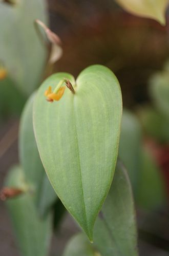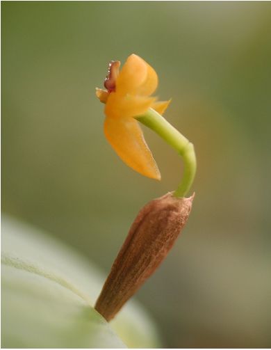 Found in Choco Colombia at elevations around 2500 to 2700 meters as a small sized, cold growing epiphyte with erect, slender ramicauls enveloped by a closely adpressed, tubular sheath near the middle and 2 others at the base and carrying a single, apical, horizontal, coriaceous, narrowly ovate, acute, sessile and deeply cordate base leaf that blooms in the spring on fascile of short, within the spathe, successive single flowered inflorescence arising through a suberect spathe with thin, tubular floral bracts.
