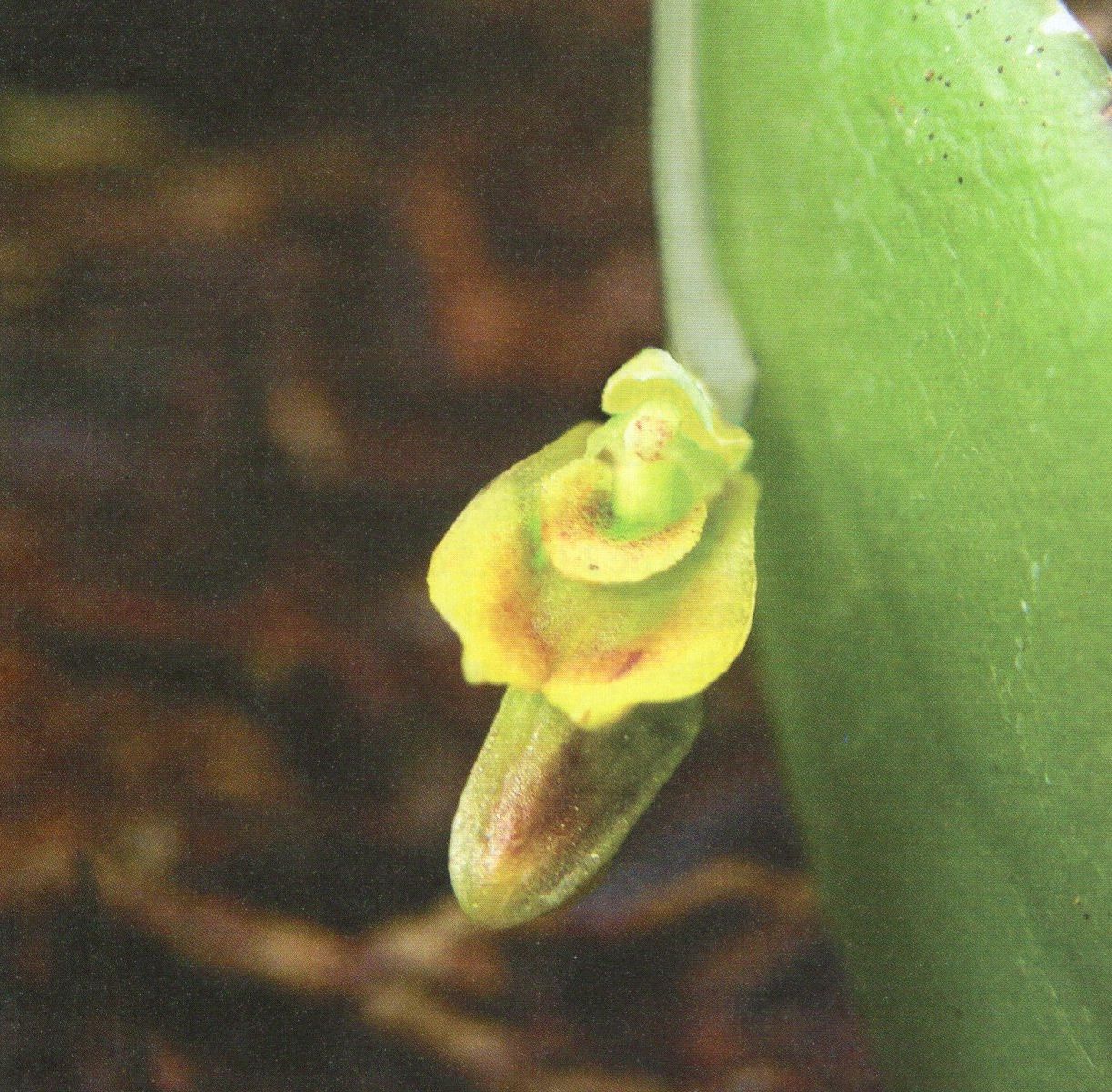 Found in Para state of Brazil in forests at elevations around 160 meters as a miniature sized, hot growing epiphyte with a thin, erect, terete, longitudinally grooved ramicaul carrying a single, elliptic-lanceolate, coriaceous leaf that blooms in the summer on a racemose, much shorter thant he leaf, arising through a spathe, successively 1, to 3 flowered inflorescence carrying campanulate flowers.