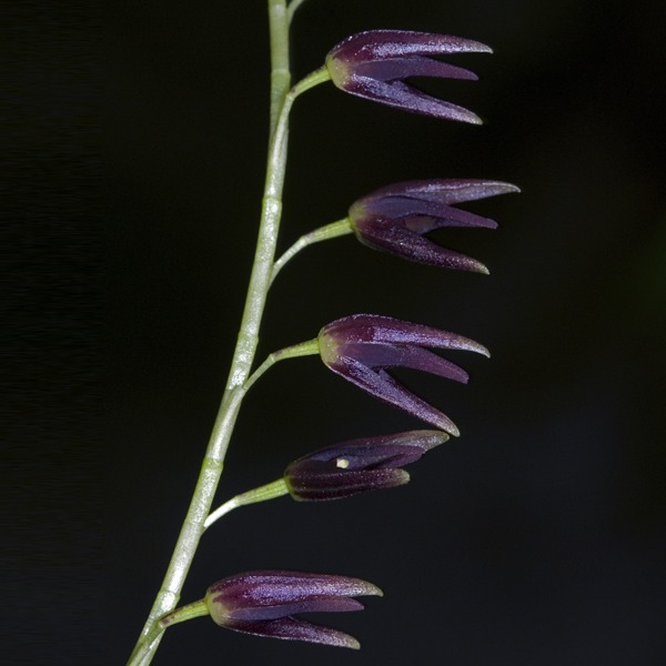 Found in Ecuador, Peru and Bolivia at elevations around 1600 to 2600 meters as a small to just medium sized, cool to cold growing epiphyte with stout, erect ramicauls enveloped by a close tubular sheath below the middle and 2 to 3 others at the base and carrying a single, apical, erect, coriaceous, elliptical, subacute to obtuse, cuneate below into the ill defined, petiolate base leaf that blooms in the summer and fall on an erect to arching, secund, loose, 8 to 12" [20 to 30 cm] long including the 4" [10 cm] long peduncle, simultaneously several to many flowered inflorescence arising through a narrow spathe and has a tubular, oblique floral bract.