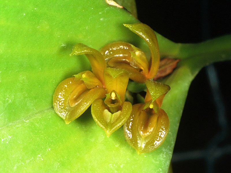 Found in Bolivia, Peru and Ecuador in tropical wet forests at elevations around 350 to 950 meters as a small sized, hot to warm growing epiphyte with erect to subpendulous, basally terete, apically winged, sulcate stems enveloped basally by 2 to 3, tubular, scarious sheaths and carrying a single, apical, fleshy, dark green elliptic-lanceolate, gradually narrowing below into the winged base leaf that blooms in the spring on a very short, successively single flowered inflorescence arising from a spathe at the base of the leaf and holding the flower close in.