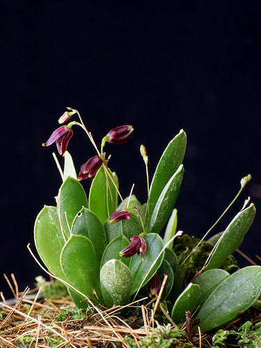 Found in Mexico, Guatemala, El Salvador, Honduras, Nicaragua and Costa Rica at elevations of 1200 to 1550 meters as a mini-miniature sized, cool growing epiphyte with slender, erect ramicauls enveloped by 2 thin, tubular sheaths and carrying a single, apical, erect, coriaceous, narrowly to broadly elliptic-obovate, subacute to obtuse, narrowing below into the petiolate base leaf that blooms at most any time of the year on an erect, to 3.2" [8 cm] long, lax, distichous, flexible, flexuous, successively several flowered inflorescence arising laterally from the ramicaul with oblique floral bracts.