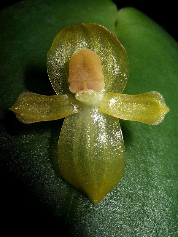 Characterized by the non-resupinate flower arising through a reclining spathe at the base of a cordate leaf with the middle sepal round and the uppermost synsepal behind the lip is transversely ovate. The petals are widest towards the apex and are apiculate and the lip is subqudrate and diffusely verrucose.