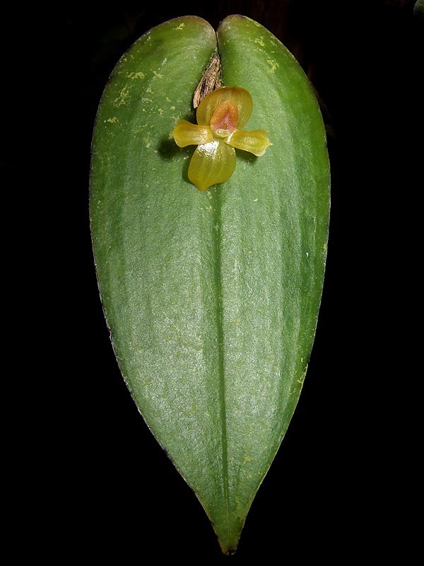 Found in northwestern Venezuela 1500 to 2600 meters as a small sized, warm to cool growing epiphyte with slender, erect to suberect ramicauls enveloped basally by a close tubular sheath near the middle and 2 others at the base and carrying a single, apical, suberect to horizontal, coriaceous, ovate to narrowly ovate, cordate, acute, slightly acuminate, basally sessile leaf that blooms in the spring, summer and fall on a successively single flowered inflorescence arising from a reclining spathe with thin, tubular floral bracts carrying a non-resupinate flower.