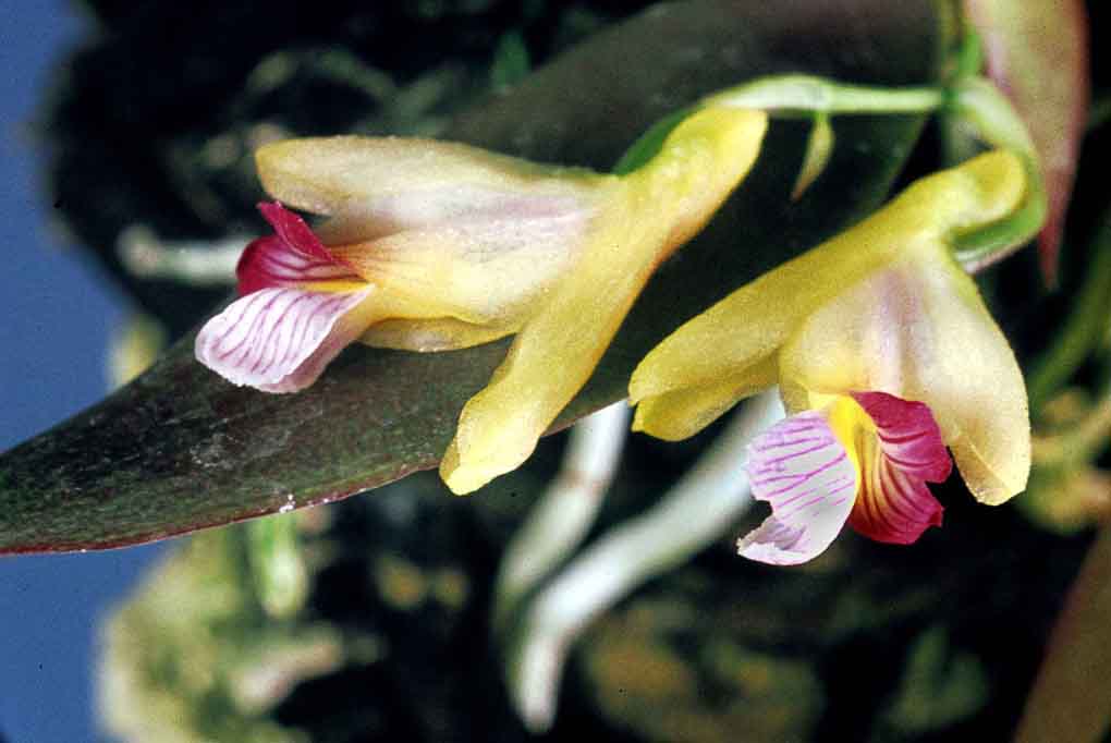 Found in Cuzco Peru near Macchu Picchu in seasonally dry cloud forests at elevations around 2000 to 2300 meters as a small sized, cold growing terrestrial with a creeping rhizome giving rise to slender, cylindrical pseduobulbs carrying a single, apical, erect, oblong-elliptic, acute leaf that blooms in the spring on a single, basal, loose, paniculate, with 1 to 2 short, ascending lateral branches, to racemose, suberect to arching, 9 to 11" [22.5 to 27.5 cm] long, many flowered inflorescence