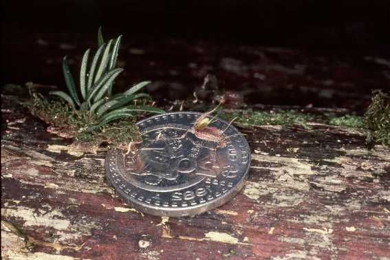 Found from Mexico, Belize, Guatemala, Honduras and Costa Rica at elevations of 50 to 500 meters as a mini-miniature szied, hot growing epiphyt with erect, slender ramicauls enveloped by 2 short, ribbed sheaths and carrying an erect, thickly coriaceous, linear-obovate, thickly subtriangular in cross-section, subacute to obtuse, gradually narrowing below into the subpetiolate base leaf that blooms at most any time of the year on an apical, solitary flowered inflorescence that is longer than the leaves.