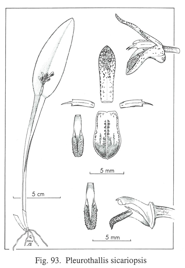 Pleurothallis sicariopsis Luer 1981 SUBGENUS Acianthera SECTION Sicariae SUBSECTION Sicariae Luer 1986 Drawing by © Carl Luer and The Swiss Orchid Foundation at the Jany Renz Herbaria Website