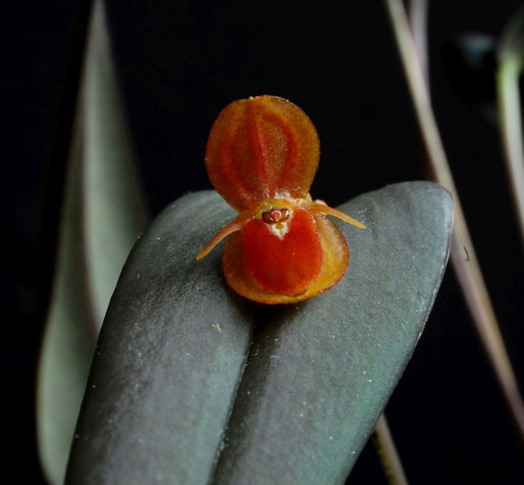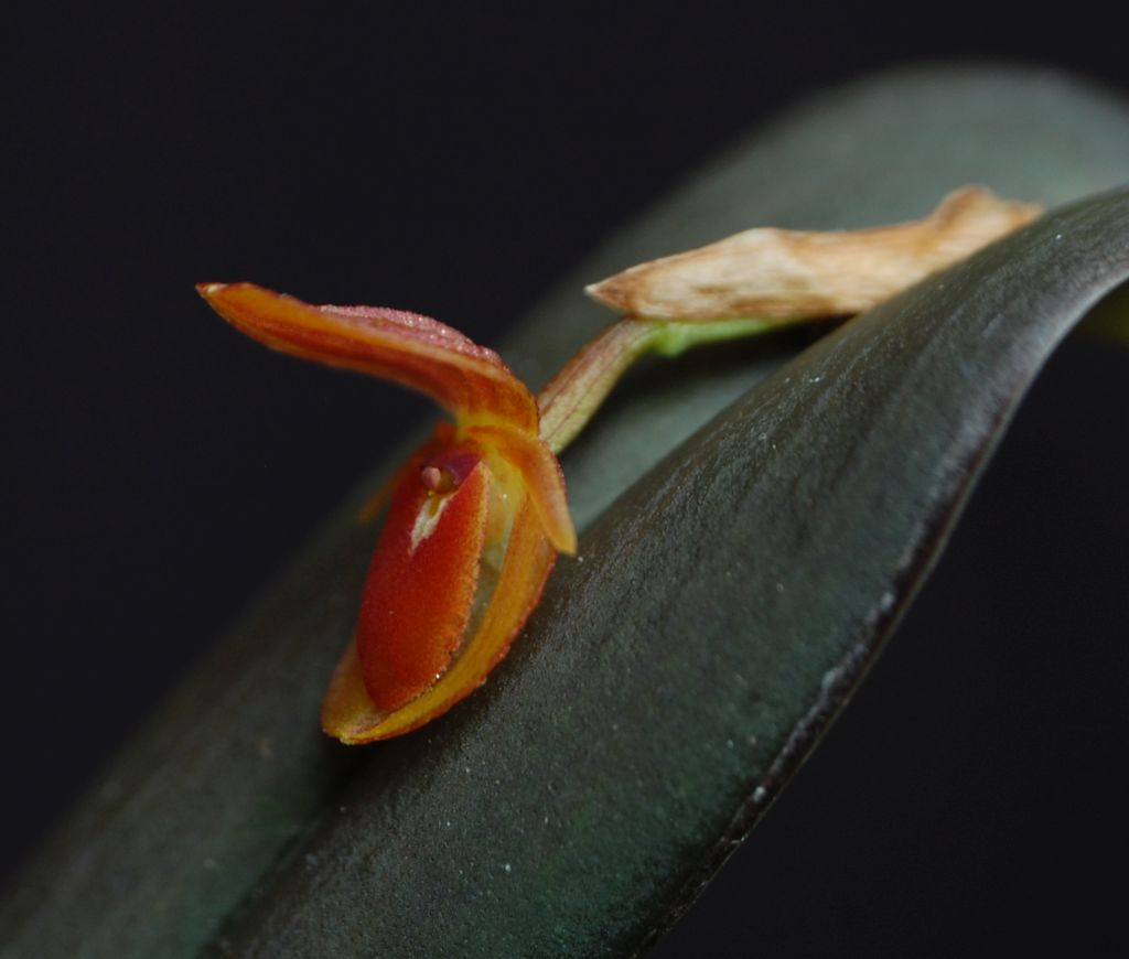 Found in Colombia and Ecuador at elevations around 1500 to 1800 meters as a miniature to medium sized, cool growing epiphyte with slender, erect ramicauls enveloped by a close, tubular sheath below the middle and 2 to 3 others at the base and carrying a single, apical, erect, coriaceous, ovate to narrowly ovate, acute, cordate below into the sessile base leaf that blooms in the fall and winter on a fascile of 1 to 5, to .6 to .28 to .4" [7 to 10 mm] long peduncle, successively single, few flowered inflorescence arising and concealed within a spathe at the apex of the ramicaul with a tubular floral bract.