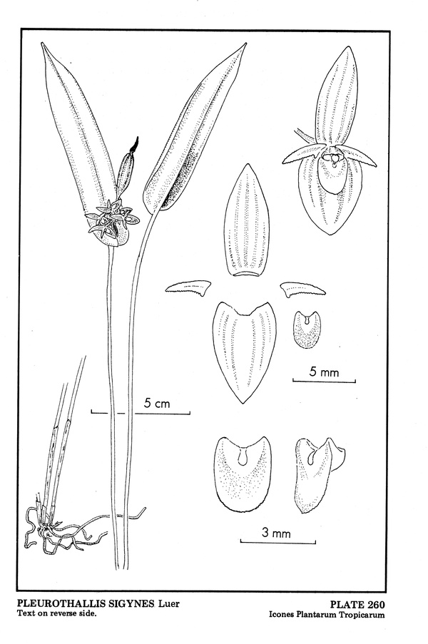 References W3 Tropicos, Kew Monocot list , IPNI ; Icones Plantarum Tropicarum Plate 260 Dodson 1980 drawing fide; Icones Pleurothallidinarum Vol XXVII Luer 2005 drawing fide as Acronia sigynes