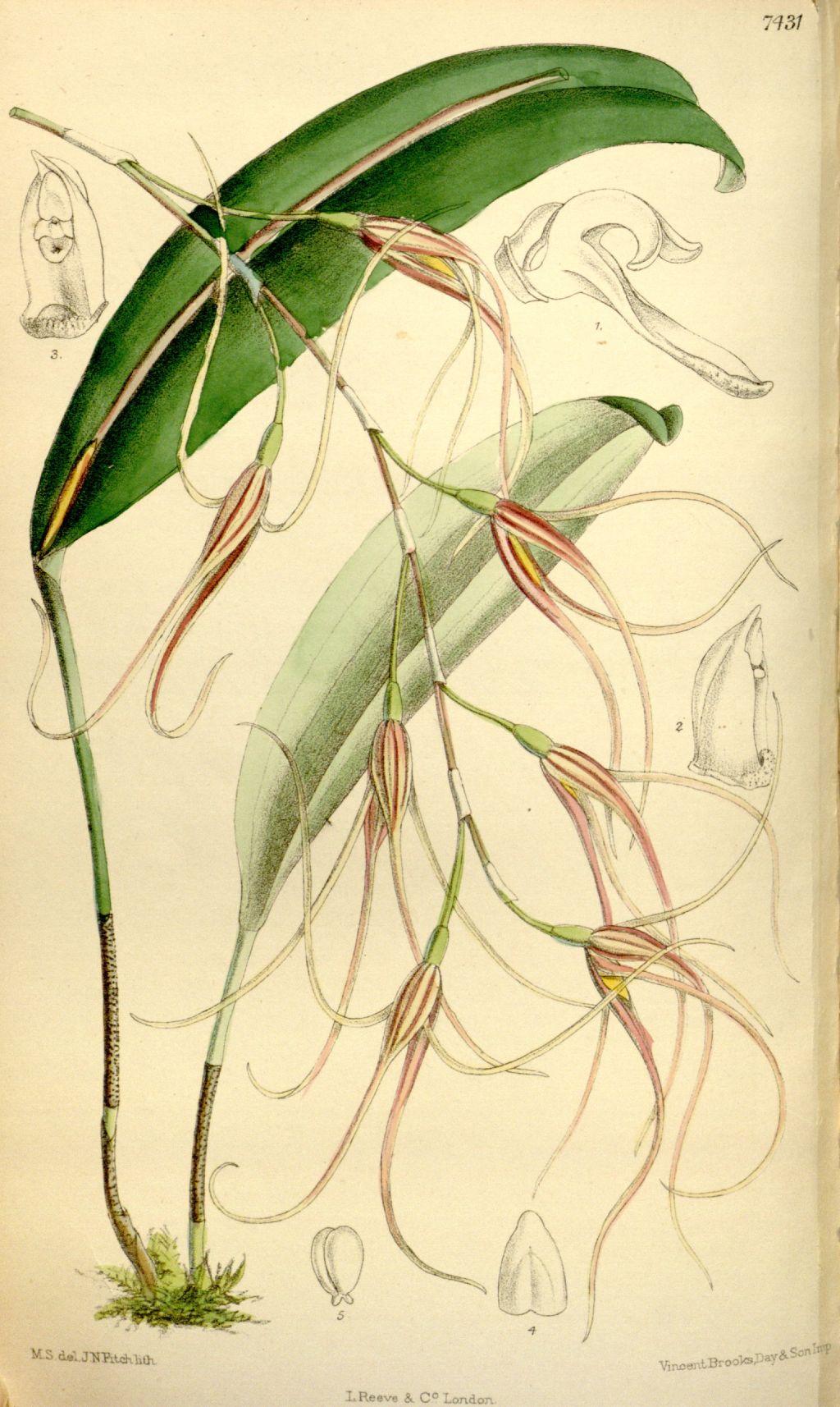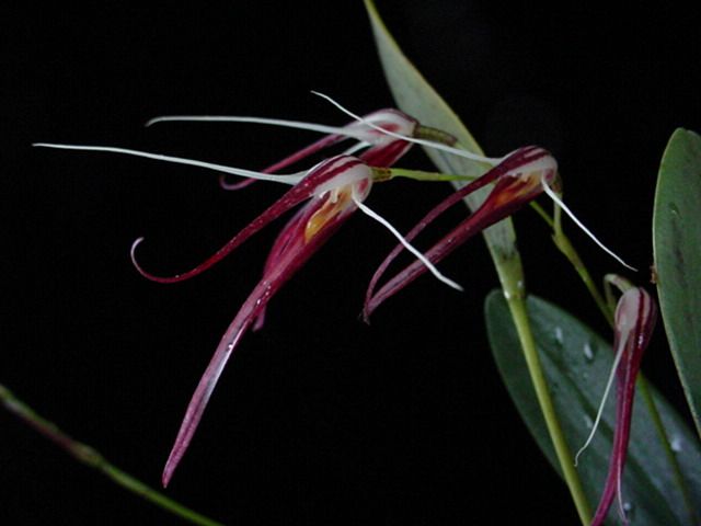 Found in northeastern Colombia and northwestern Venezuela at elevations of 2000 to 2400 meters as a small to medium sized, cold growing epiphyte with smooth, stout, erect ramicauls enveloped by a tubular sheath below the middle and 1 to 2 shorter ones at the base and carrying a single, apical, erect, coricaeous, elliptical, subacute to obtuse, cuneate below into the subsessile base leaf that blooms in the summer and fall on a loose, subsecund, 4 to 8" [10 to 20 cm] long, simultaneously few to several flowered inflorescence arising through a reclining spathe at the base of the leaf and has thin, tubular floral bracts.
