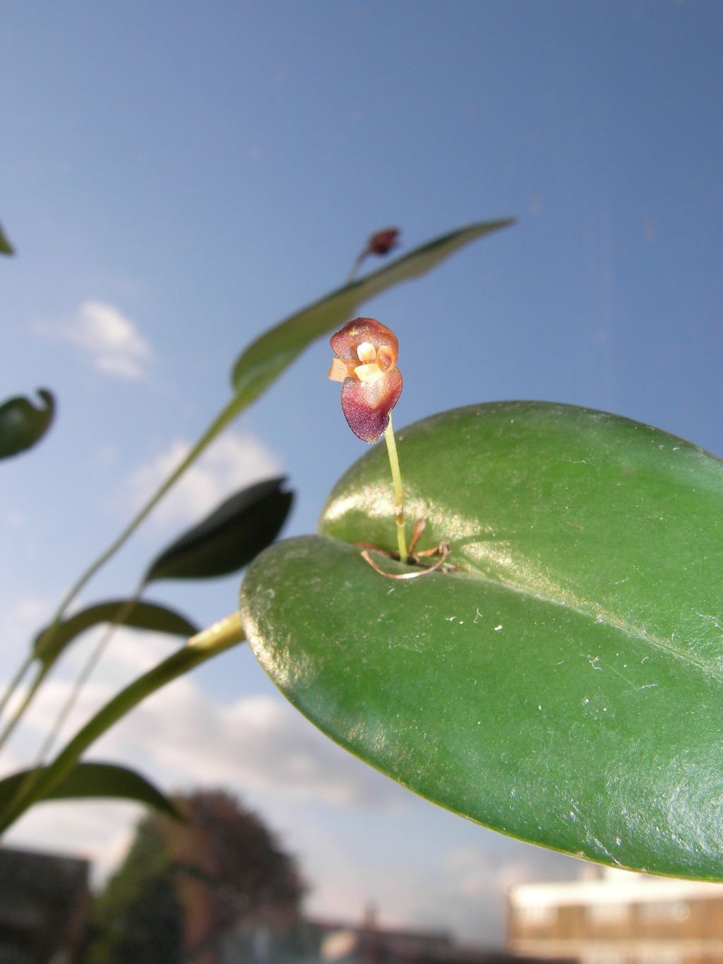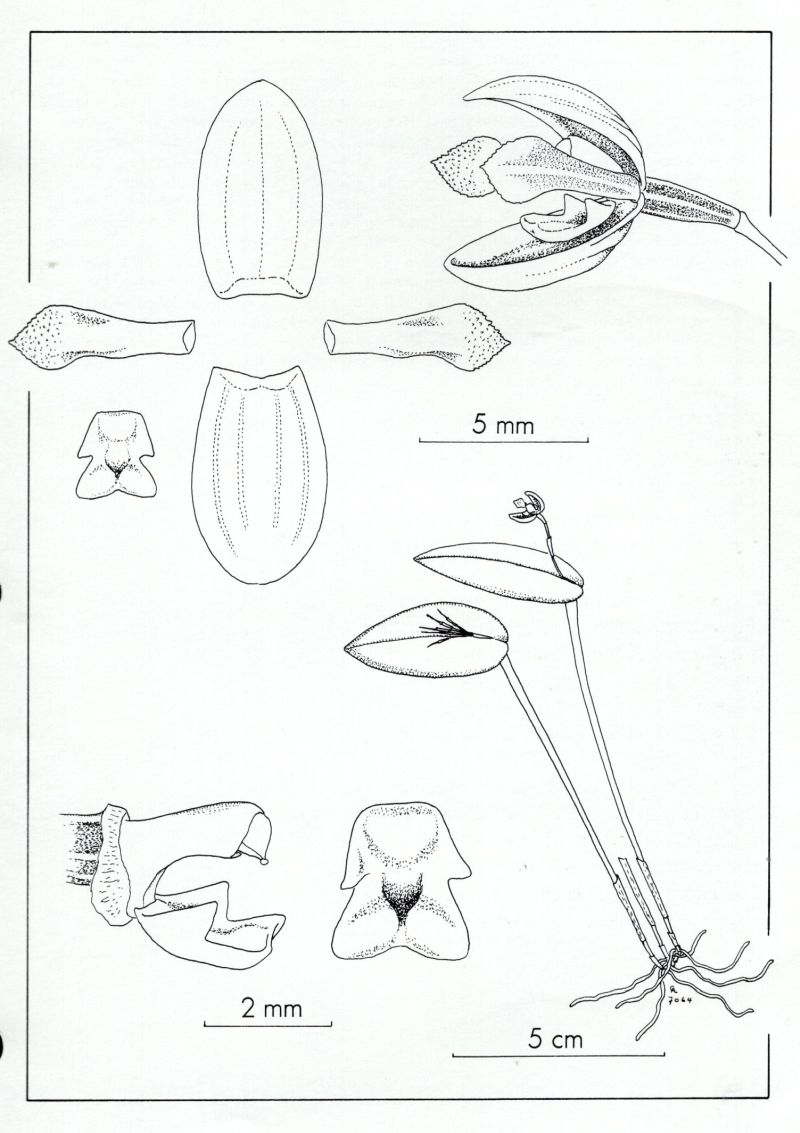 Found in southeastern Ecuador at elevations of 1200 to 1800 meters as a small sized, cool growing epiphyte with slender, erect, sharply ancipitous above the middle ramicauls enveloped basally by 2 to 3 tubular sheaths and carrying a single, apical, suberect to spreading, coriaceous, ovate, acute, basally rounded, subcordate and sessile leaf that blooms in the late winter on a filiform, suberect, .4 to .6" [1 to 1.5 cm] long, fascile of solitary, successive, single flowered inflorescence arising through a reclining spathe.