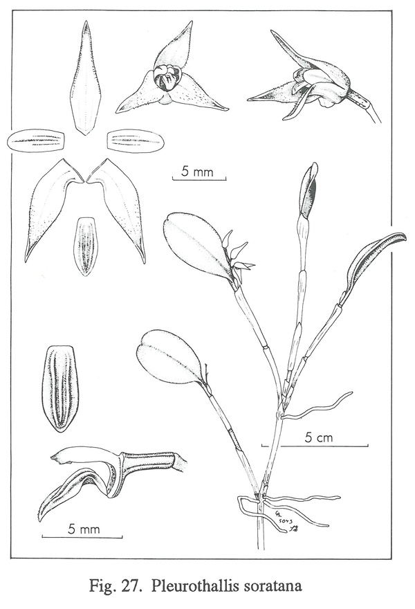 References W3 Tropicos, Kew Monocot list , IPNI ; Icones Pleurothallidinarum Vol III Luer 1986; Icones Pleurothallidinarum Vol XVIII Systematics of Pleurothallis subsection Antenniferae, Longiracemosae, Macrophyllae-Racemosae and Subgenera Pseudsostelis and Acuminata Luer 1999 drawing fide; Orchids of Bolivia Vasquez & Ibisch Vol 1 2000 drawing fide; Icones Pleurothallidinarum Vol XXVI Luer 2004 as Specklinia soratana; LANKESTERIANA 13(3): 319—332 Kerremans 2014 as Stelis soratana