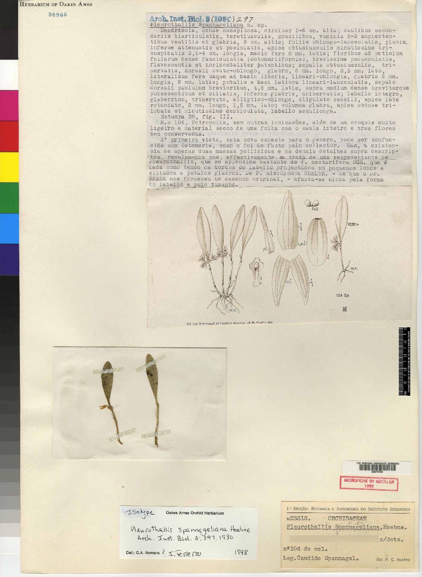 References W3 Tropicos, Kew Monocot list , IPNI ; Orchidaceae Brasilensis Band 1 Pabst & Dungs 1975 drawing good; Icones Pleurothallidinarum Vol XVIII Systematics of Pleurothallis subsection Antenniferae, Longiracemosae, Macrophyllae-Racemosae and Subgenera Pseudsostelis and Acuminata Luer 1999; Icones Pleurothallidianrum XXVI Luer 2004 as Specklinia spannageliana