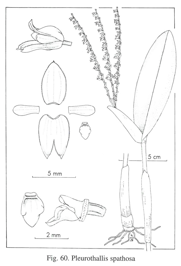 Pleurothallis spathosa Luer & R.Escobar 1996 SUBGENUS Crocodeilanthe [Rchb.f & Warsc.]Luer 1986 Drawing by © Carl Luer and The Swiss Orchid Foundation at the Jany Renz Herbaria Website