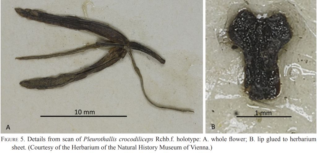 References W3 Tropicos, Kew Monocot list , IPNI ; *Bonplandia Rchb.f 1855; AOS Bulletin Vol 27 No 6 1958; Flora de Venezuela Foldats Volumen XV Part 2 1970 not = P arietina; Fieldiana Biology, Vol 33, 1st Supple. to the Orchids of Peru Schweinfurth 1970; Orchids of Venezuela, An Illustrated Field Guide Vol 3 Dunsterville & Garay 1979 drawing not = P arietina; Icones Pleurothallidinarum Systematics of Pleurothallis Vol 3 Luer 1986; Icones Pleurothallidinarum Vol VI Systematics of Pleurothallis subgen Ancipita, Scopula and Trisetella Luer 1989 drawing not = P arietina; Orchids Travel By Air A Pictoral Safari Mulder, Mulder-Roelfsema and Schuiteman 1990 photo fide; Native Colombian Orchids Vol 6 COS 1998 photo fide; Orchids of Venezuela [An illustrated field guide] Vol. 3 Ramiro and Carnevali 2000 drawing not = P arietina; Orquideas Nativas del Tachira Cesar Fernandez 2003 photo fide; Manual de Plantas de Costa Rica Vol 3 Hammel, Grayum, Herrera and Zamora 2003 drawing fide; Icones Pleurothallidinarum Vol XXVI Luer 2004 as Ancipitia crocodieliceps; Orchids of Costa Rica Vol 5 Morales 2009 photo fide; Orchids of Tropical America Meisel 2014 photo fide; LANKESTERIANA 17(2) Wilson etal 2017; Vanishing Beauty, Native Costa Rican Orchids Vol 2 Lacaena to Pteroglossa Pupulin 2020 photo fide