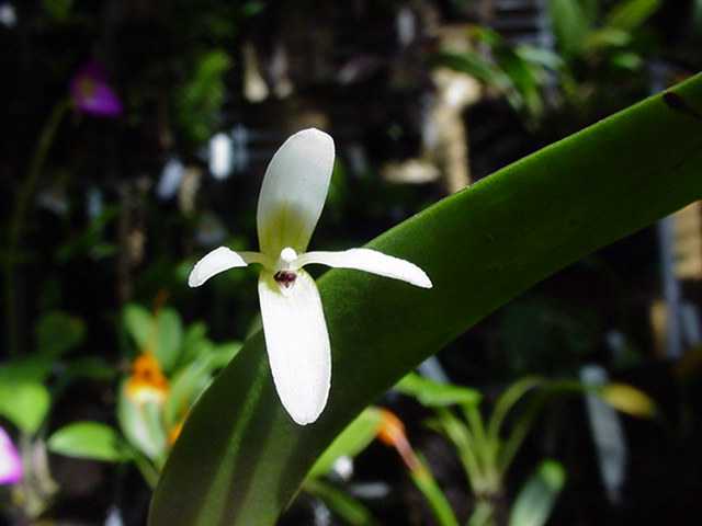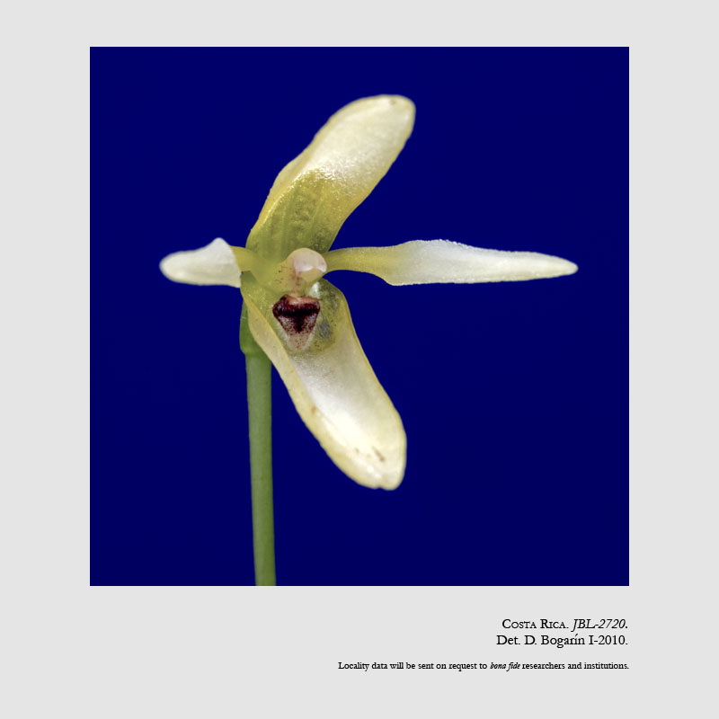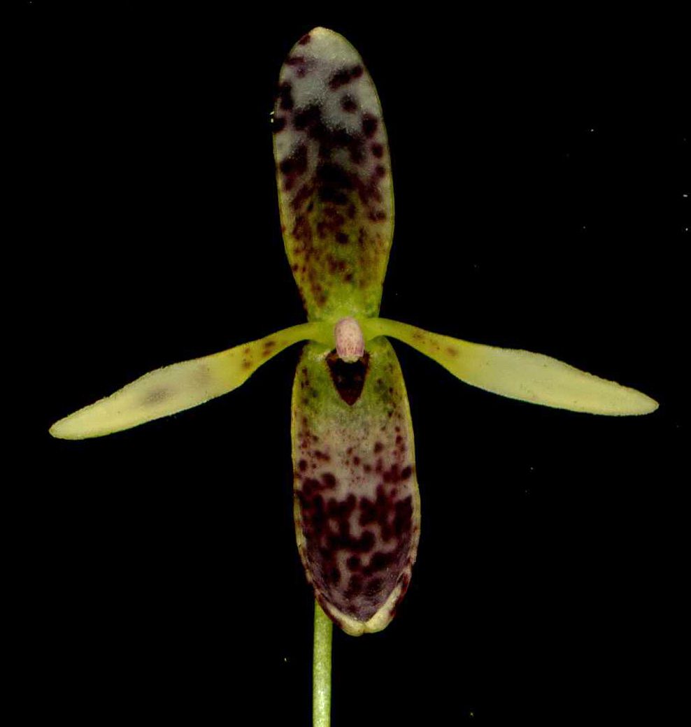 Found in Mexico, Guatemala, Costa Rica, Panama, Colombia, Ecuador, Peru and Venezuela at elevations of 400 to 3000 meters as a small sized,warm to cold growing epiphyte with slender, erect ramicauls that are sharply ancipitous above the middle and 2 to 3 basal, tubular sheaths and another larger one just below the middle, carrying a single, apical, rigid, coriaceous, ovate, acute, rounded base, cordate, sessile leaf that blooms in the summer to a fascile of solitary, successive flowers, arising through a reclining spathe, .12" [3 mm] long, filiform, reclining, ascending to erect inflorescence with a single tubular floral bract carrying a single successive flower.