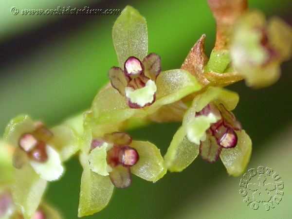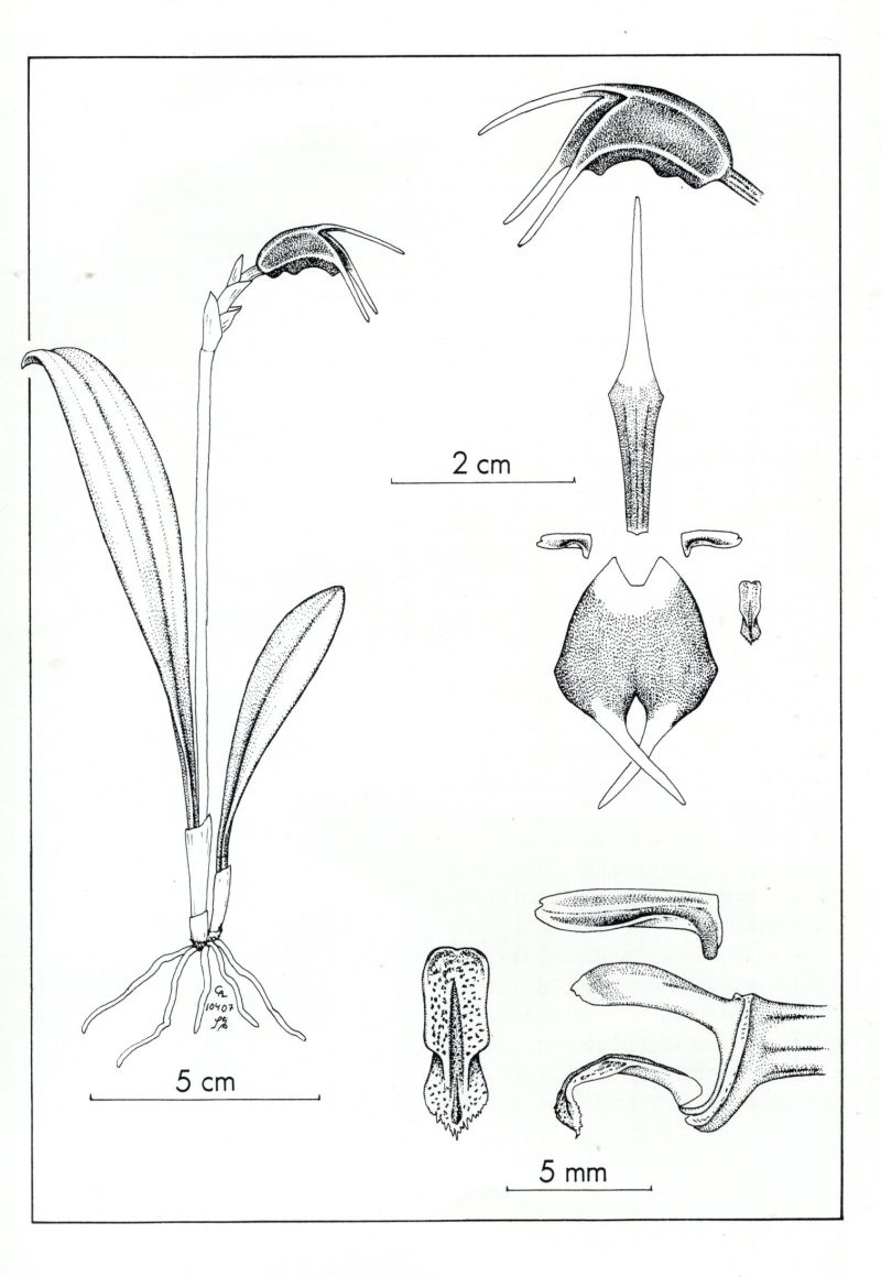 Found in Colombia and Ecuador in dense forests at elevations around 1800 to 2500 meters as a mini-miniature to small sized, cool to cold growing epiphyte with a slender, erect ramicaul with a tubular sheath near the middle and 2 others at the base and carrying a single, apical, erect, coriaceous, narrowly elliptical, acute to subacute, narrowly cuneate below into the petiolate base leaf that blooms in the winter on an erect, strict, sublax, subsecund, 2 to 6" [5 to 15 cm] long, simultaneously several to many flowered, racemose inflorescence arising through a spathe and an annulus below the apex of the ramicaul with oblique, acute floral bracts.