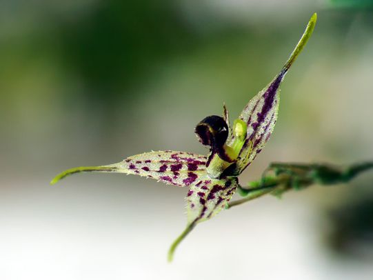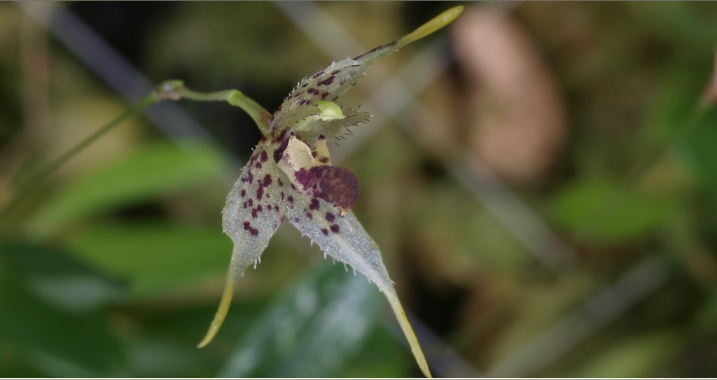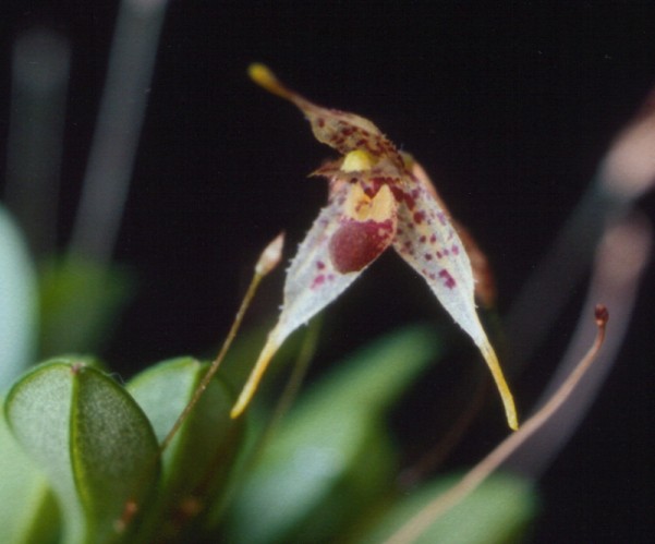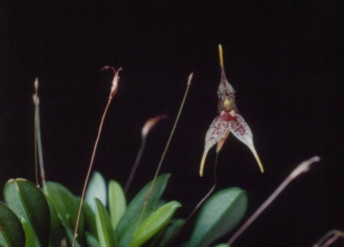 Found in Guatemala and Costa Rica in wet montane and cloud forests at elevations of 1400 to 1650 meters as a mini-miniature sized, warm to cool growing epiphyte with slender, erect ramicauls enveloped by 2 thin, tubular sheaths and carrying asingle, apical, erect, coriaceous, narrowly obovate, subacute, gradually narrowing below into the petiolate base leaf that blooms at most any time of the year on a fascile of successive single flowers arising from the ramicaul on an erect, 1" to 1.6" [2.5 to 4 cm]long, filamentous inflorescence