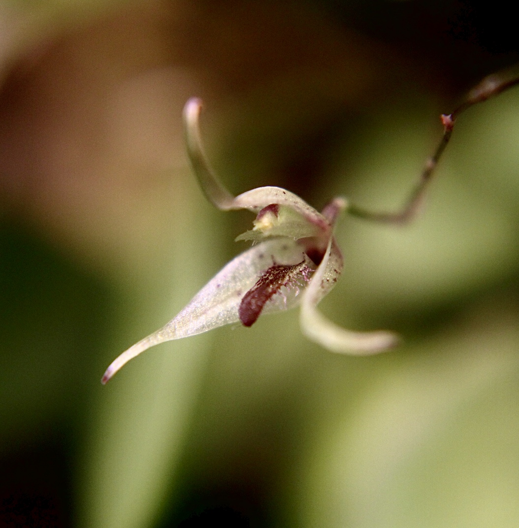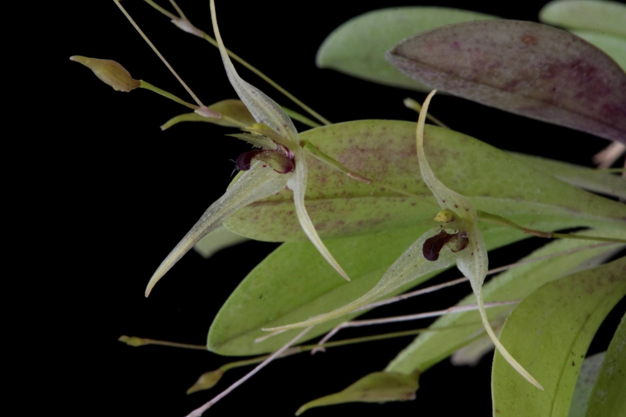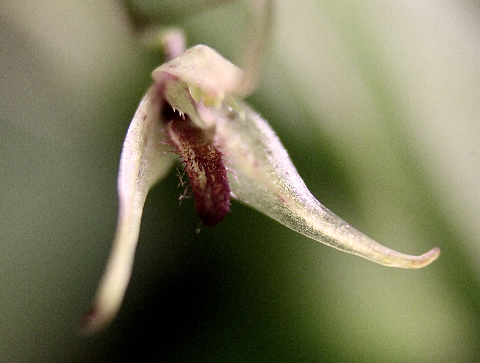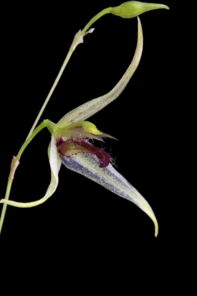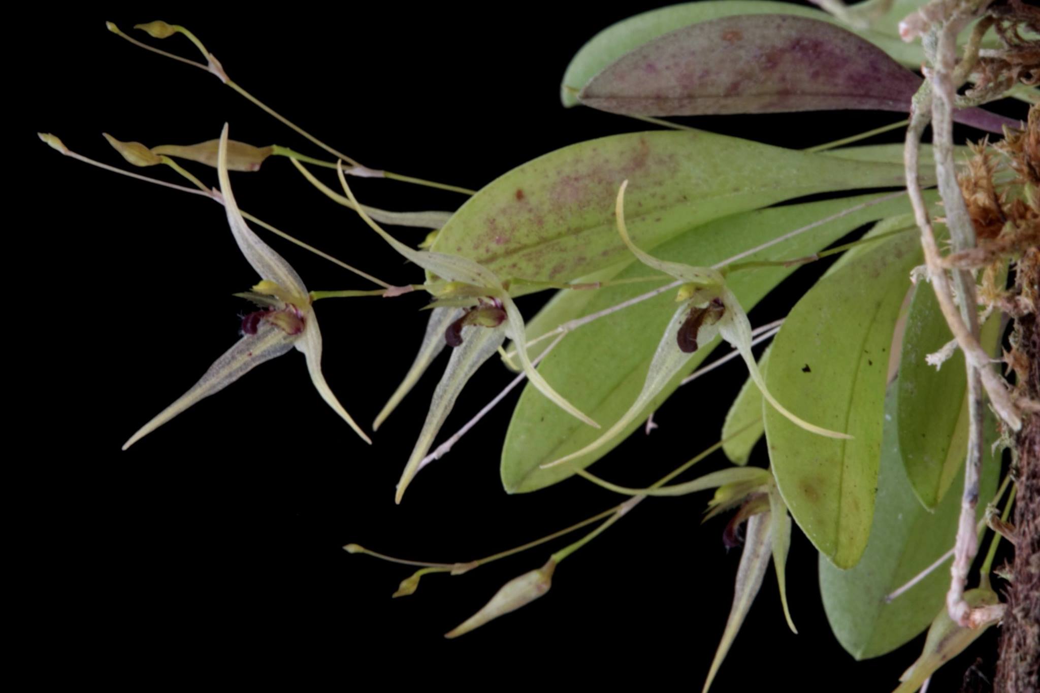 Found in Ecuador and northern Peru in cloud forests at elevations around 2500 meters as a mini-miniature sized, cold growing epiphyte with slender, erect ramicauls enveloped by 2 thin, tubular sheaths and carrying a single, apical, erect, coriaceous, narrowly obovate, subacute to obtuse, narrowly cuneate below into the petiolate base leaf that blooms in the summer on an erect, loose, flexible, flexuous, filiform, 3.2" [8 cm] long including the 1.2 to 1.6" [3 to 4 cm] long, successively several flowered inflorescence arising laterally from the ramicaul.