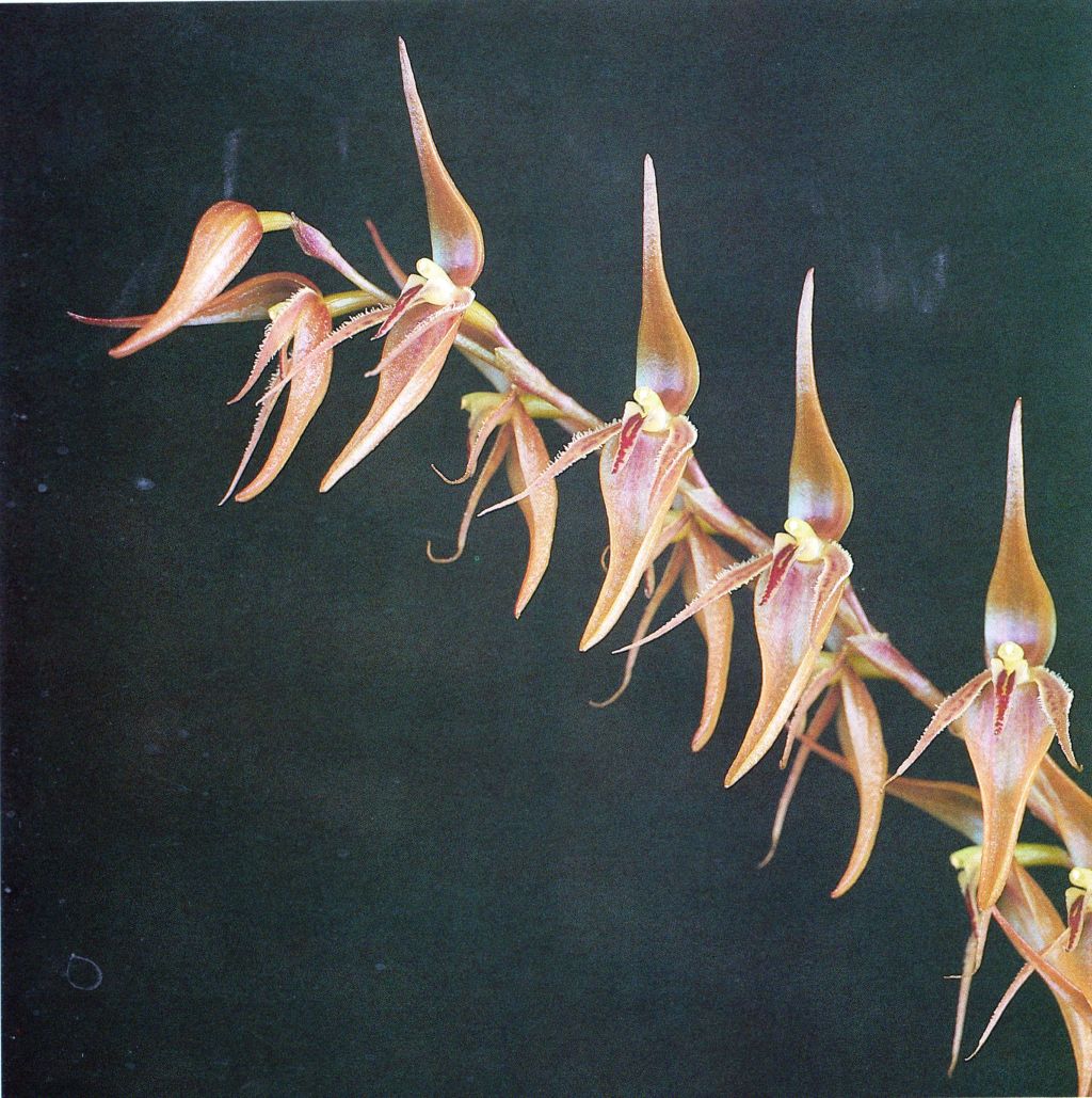 Found in Colombia at elevations of 2500 to 2700 meters as a small sized, cold growing epiphyte with stout, erect ramicauls enveloped basally by 2 to 3 close, tubular sheaths and another below the middle carrying a single, apical, erect, coriaceous, ovate, acute leaf that has a broadly cuneate to rounded and sessile base that blooms in the spring and fall on a loose, distichous, simultaneously several flowered, 4 3/4" to 8" [12 to 20 cm] long, racemose inflorescence arising from a reclining spathe and having thin, infundibular floral bracts.