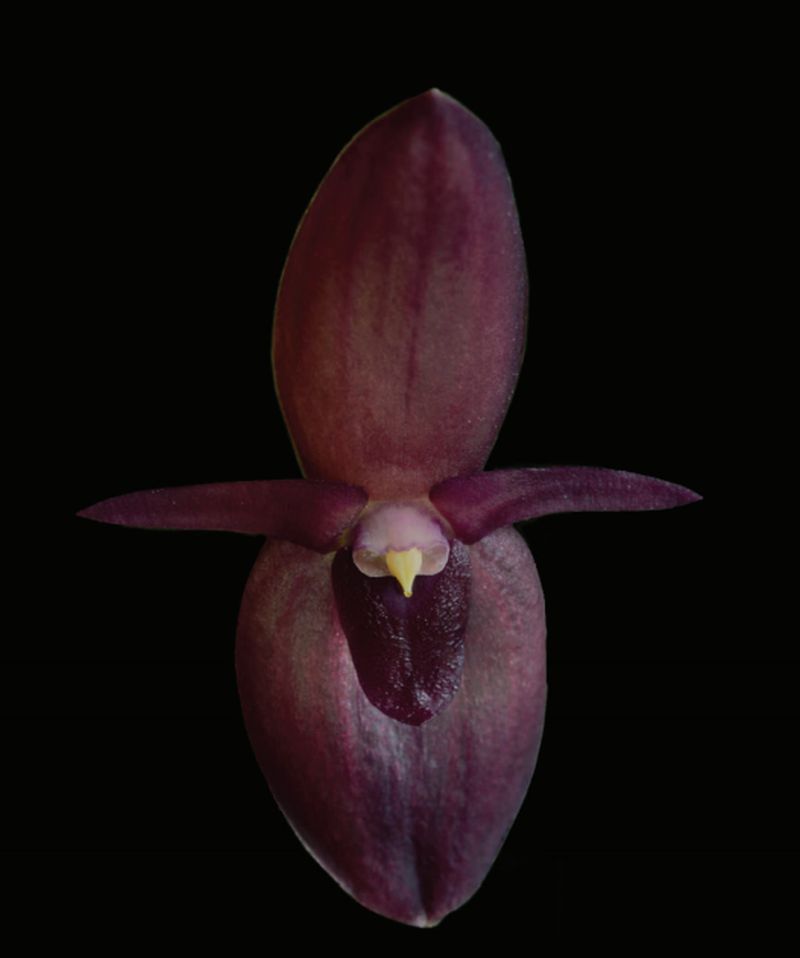 Found in San Jose province of Costa Rica in premontane wet forest on the Caribbean slopes of the Cordillera de Talamanca in lower montane rain forests to wet montane forests at elevations around 1300 to 1800 meters as a small sized, cool growing, caespitose epiphtye with erect, terete, slender, yellowish green ramicauls enveloped by 2 basal, tubular, obtuse, glumaceous, pale green with purple warts becoming papyraceous, brown sheaths and carrying a single, apical, horizontal becoming curved-subpendent with age, thinly coriaceous, grass green, matte, sessile, flexible, ovate, narrowly acute, acuminate, deeply cordate base leaf that blooms in the late winter and early spring on a .68" [1.7 cm] long, arising through a rectangular, reclining, brown, papery spathe, single flowered inflorescence.
