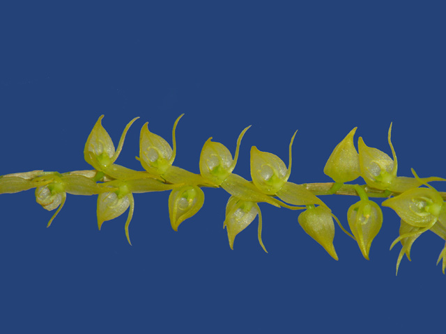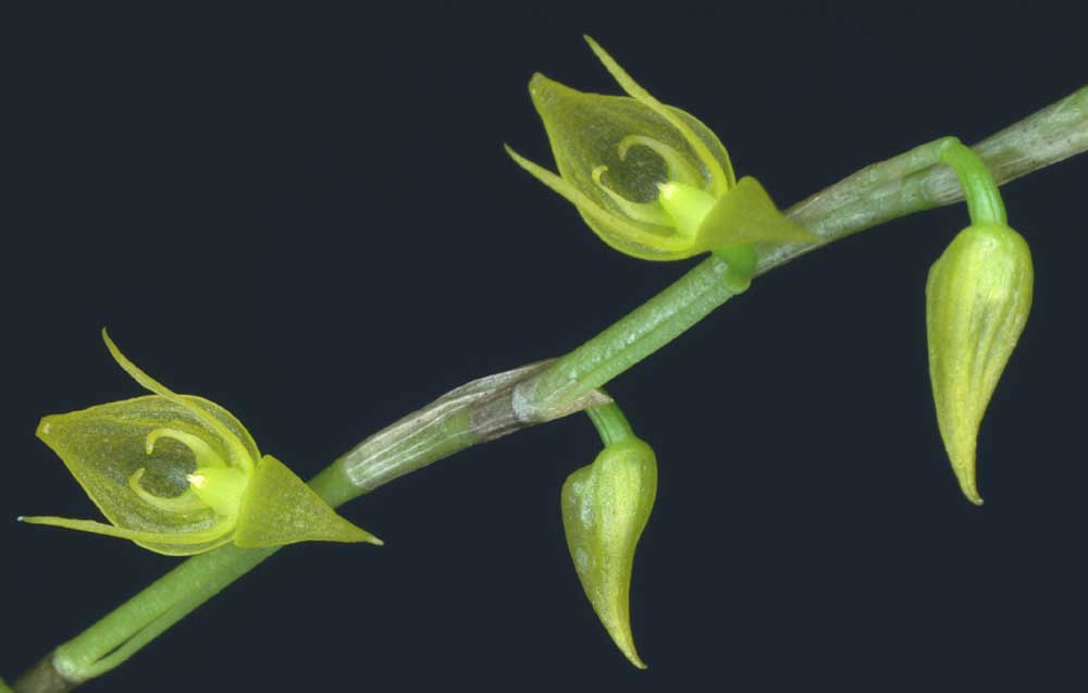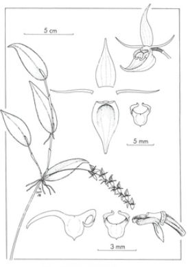 Found in Colombia and Ecuador in shady, wet tropical montane forests at elevations around 2700 to 3200 meters as a miniature sized, cold growing epiphyte with prolific, erect to suberect, slender ramicauls enveloped basally by 1 to 2 basal, tubular sheaths and another below the middle and carrying a single, apical, erect, coriaceous, narrowly ovate, acute, rounded below into the sessile base leaf that blooms in the late spring through summer on an arching to pendant, arising through a reclining spathe at the apex of the ramicaul, to 4" [to 10 cm] long, several flowered, racemose inflorescence.
