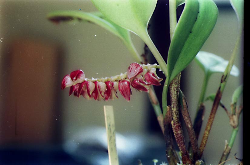 Found in Ecuador at elevations of 2730 to 2850 meters as a miniature sized, cold growing miniature epiphyte with stout erect ramicauls enveloped by 2 to 3, loose, tubular sheaths and carrying a single, apical, ovate, rounded, abruptly narrowing below into the shortly petiolate base leaf that blooms in the winter on an erect, 2.4" [6 cm] long, several flowered infloresence.