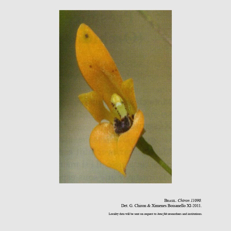 Found in Espirito Santo Brazil at elevations below 1000 meters as a mini-miniature sized, warm growing epiphyte with an erect, cylindrical ramicaul enveloped by papery, tubular sheath and carrying a single, apical, erect, obovate, round and retuse apically, cuneate below into the pseudo-petiolate base leaf that blooms in the spring on an erect, filiform, 8.8" [22 cm] long, fractiflex, simultaneously 4 to 6 flowered inflorescence.