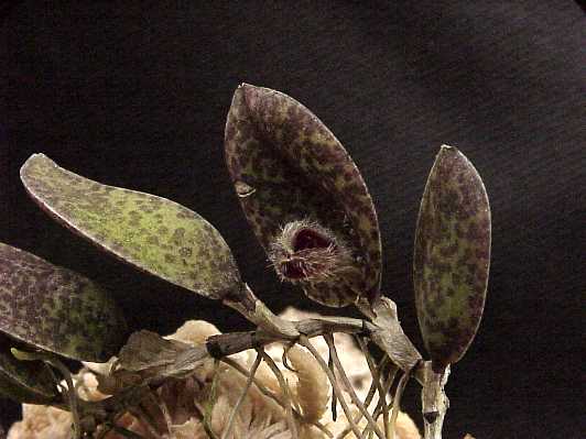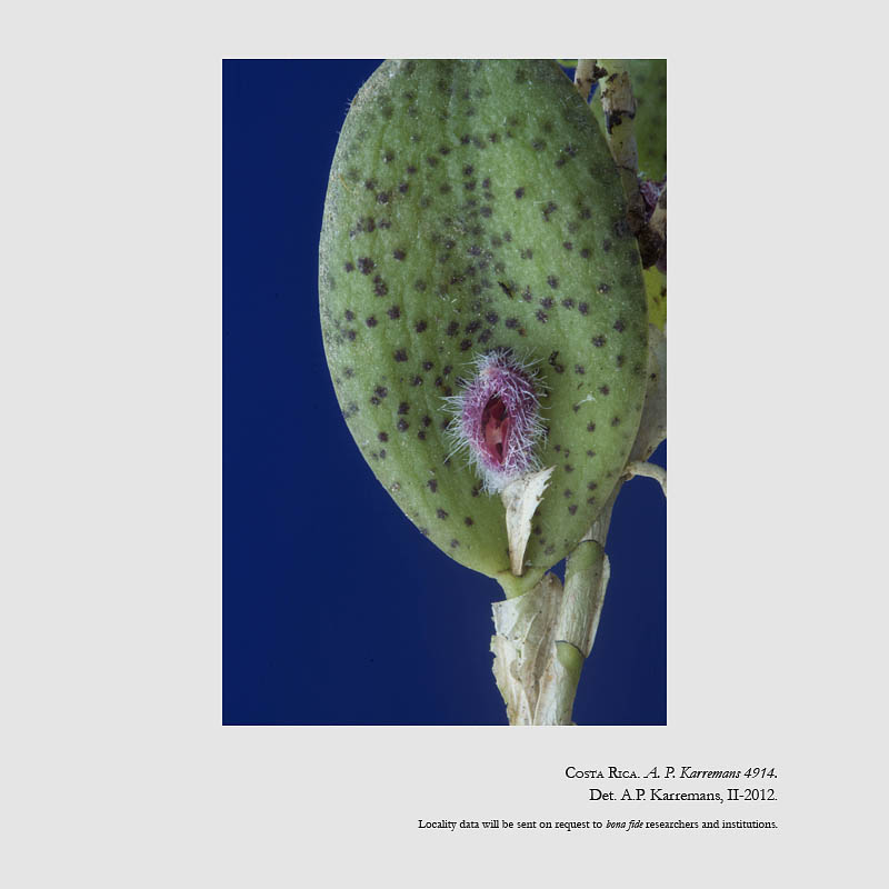 Found in Guatemala, Honduras, Costa Rica, Cuba, Dominican Republic, Jamaica, Windwards, Surinam Venezuela and Colombia in wet montane forests at elevations of 825 to 1000 meters as a miniature sized, warm growing unifoliate epiphyte with clustered, descending ramicauls enveloped by 2 to 3 papery, inflated sheaths and carrying a single apical, elliptical, subacute, green, brown blotched leaf that is cuneate into the petiole and blooms in the winter on an apical, short, single flowered inflorescence that is held close to the leaf base.