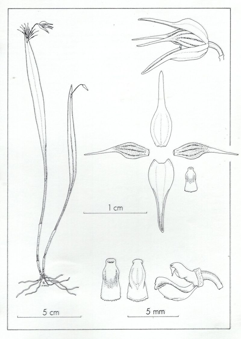 Found in southern Colombia and northern Ecuador in wet forests at elevations of 700 to 1800 meters as a small sized, warm to cool growing epiphyte with slender, erect ramicauls that have a tubular sheath below the middle and 2 others at the base carrying a single, apical, erect, coriaceous, narrowly elliptic-linear, acute, narrowly cuneate into the indistinctly petiolate base leaf that blooms in the winter on a fascile of 3/16" [5 mm] long, successive single flowered inflorescence subtended by a spathe at the apex of the leaf.