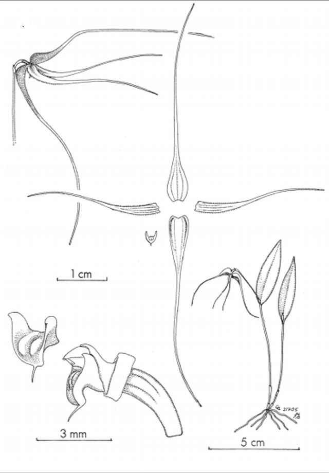 Found in southern Ecuador without locational data as a miniature sized, caespitose growing epiphyte with erect, slender ramicauls enveloped in the lower quarter by a tubular sheath with another at the base and carrying an erect, coriaceous, elliptical-ovate, slightly acuminate, acute, cuneate below into the sessile base leaf that blooms in the early winter on a slender, erect to suberect, arising from the base of the leaf with a spathe, peduncle 1" [2.5 cm] long, single flowered inflorescence with oblique, acute, shorter than the ovary floral bract and carrying flowers with rose purple sepals, light yellow orange petals, and a light yellow lip.